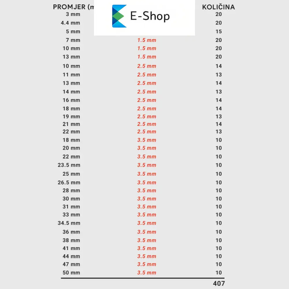 - 407 kusov: rôzne veľkosti